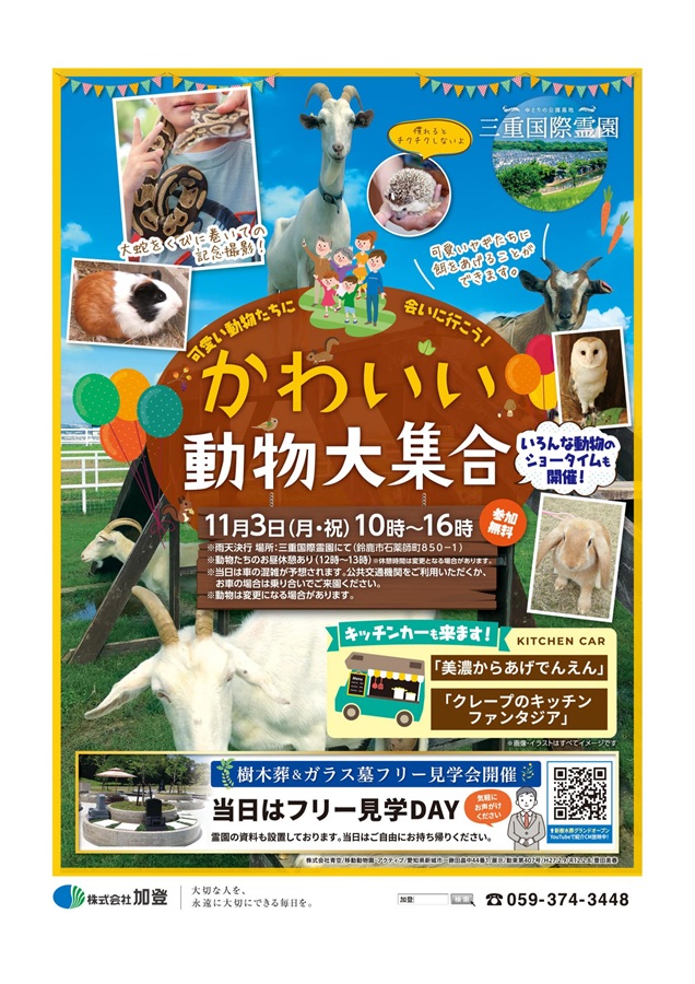 三重国際霊園にて、移動動物園と樹木葬フリー見学会を開催いたします。