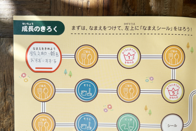ごはん・そうじ・にっきなど、やったお世話について成果をはれるシートやおうちに来てから1日記念日5日記念日10日記念日のシールもあります。忘れずにお世話をしたか、飽きずに記録ができたかを楽しく確認できますね。