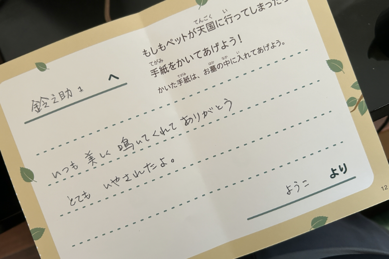 組み立て式のお墓用ボックスもあります。ペットが亡くなったら土に埋めますが、ボックスのお墓には絵日記に書いた絵を飾ったり、シールを貼ったりすることができます。ボックスの中にはお手紙も入れられます。