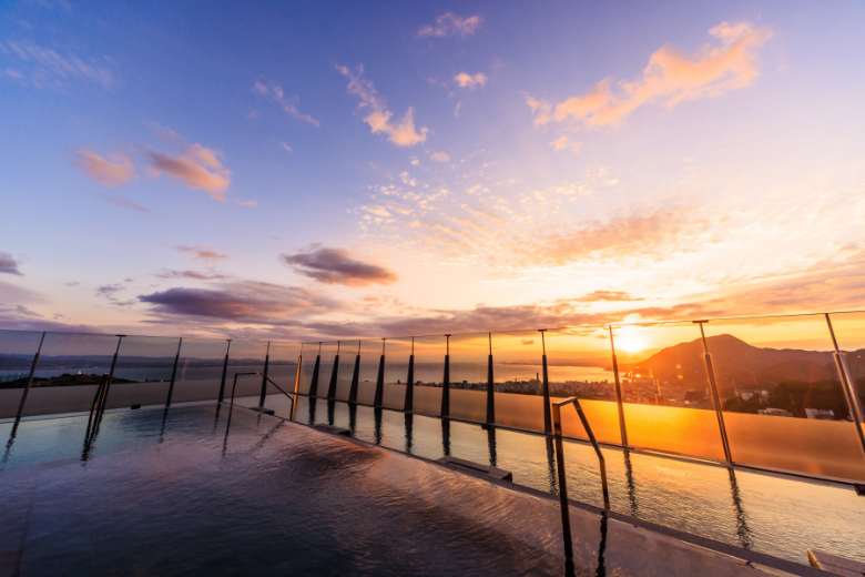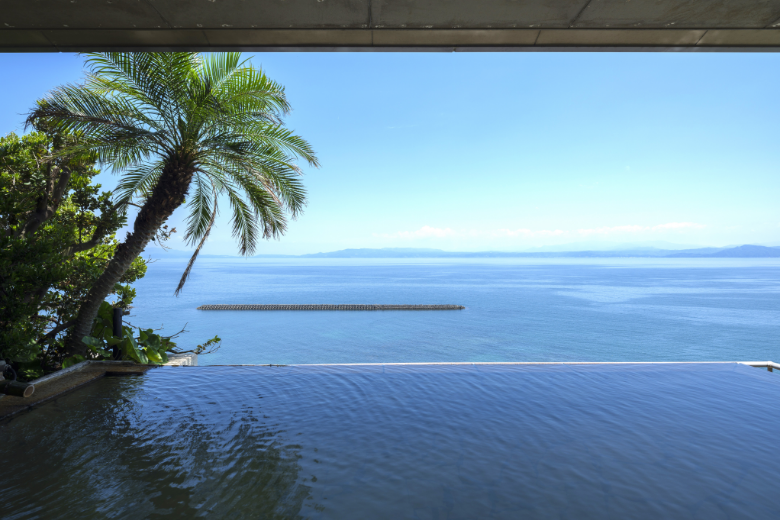 9階の天空野天風呂や雲上貸切露天風呂は、錦江湾が一望でき、どこまでが海でどこからが空かわからないほどの絶景。