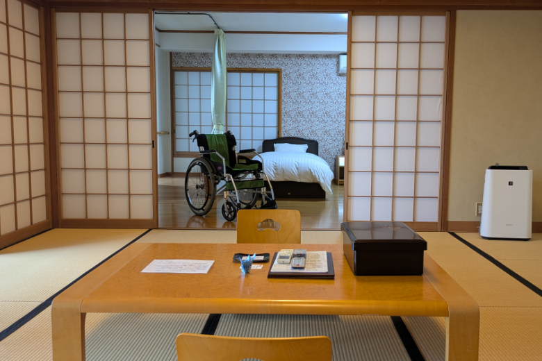バリアフリーの部屋は1室のみですので、予約は早めが良さそうです。ツインベッドのうち1台が介護用。低床(45㎝)・柵付きなので、車椅子からスムーズに移動ができます。7人まで泊まれるゆったりした客室なので、3世代の宿泊にもぴったり。