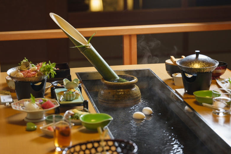 また珍しいのは、「温泉卓」。テーブルの中央から湧き出る源泉で、竹酒を温めたり、温泉卵を作ったり。温泉の香りを楽しみつつあたたかな体験ができます。
