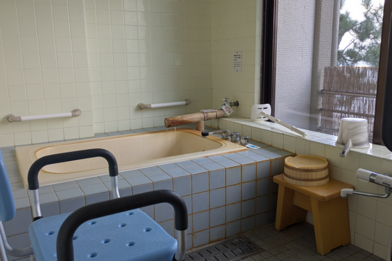 バリアフリー和洋室には内湯が2つあり(源泉かけ流し湯と沸かし湯)手すりあり。